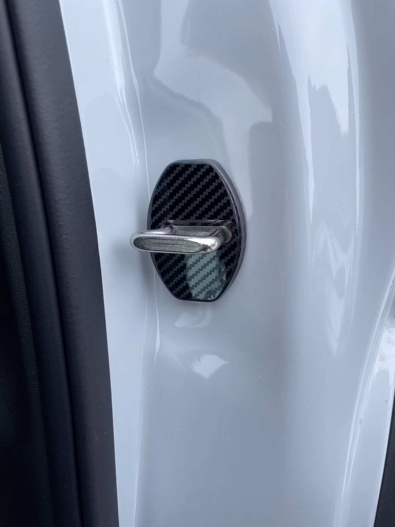 Kåpor till dörrlåset med carbon fiber-mönster. Förklistrad dubbelhäftande tejp på baksidan gör det lätt att sätta fast dem.