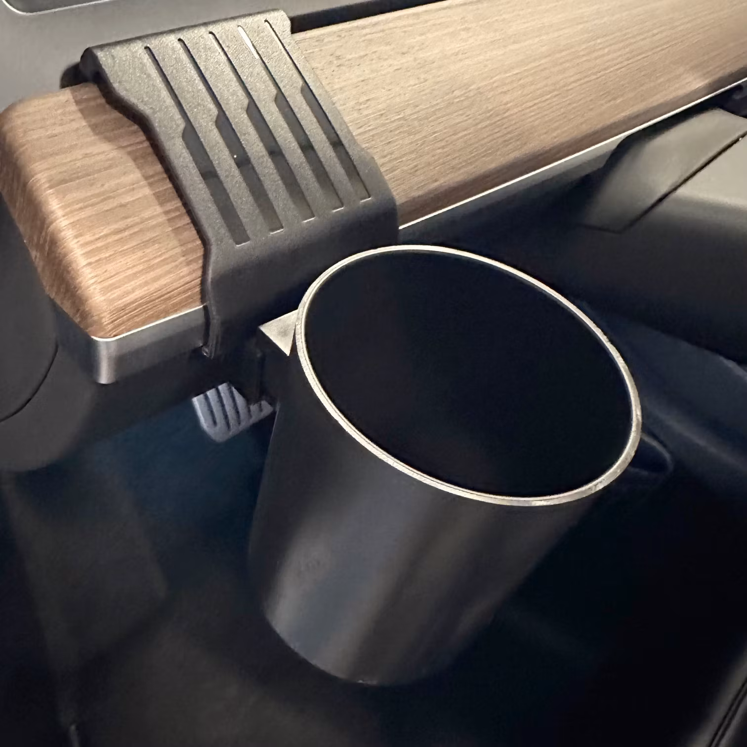 Smart mugghållare till kaffemuggen som du enkelt fäster på instrumentbrädan med ett snäppfäste samt dubbelhäftande tjep, till vänster om ratten.